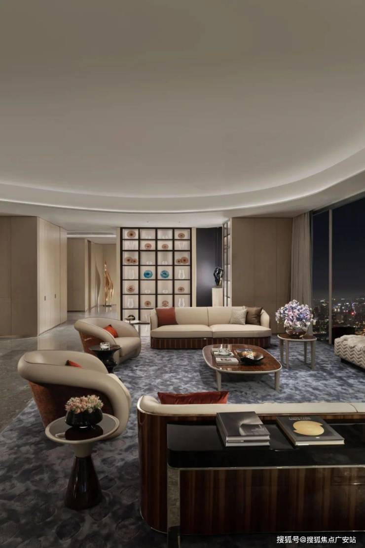 走道端处香槟色金属雕塑,形类城市高楼,又若恋人彼此依偎;全采光套房拥揽白日上海黄浦的忙碌、繁华,也收藏夜晚灯火阑珊的宁静、美好。