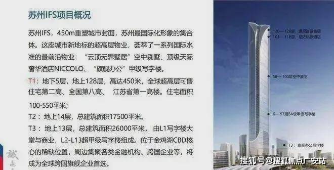 项目位于苏州工业园区金鸡湖东CBD商圈核心区,北侧毗邻新鸿基苏州环贸广场,南侧与久光百货隔中央河相望,西临圆融时代广场,东侧为思安街。项目包含三幢塔楼,总建筑面积约38万㎡。T1主塔楼是集办公、公寓、酒店为一体、高450m高的超高层综合体;T2塔楼位于T1塔楼西侧并与之相连,高80m的板式建筑,主要功能为SOHO办公;T3塔楼位于T1塔楼南侧,高74.5m,主要功能为办公。