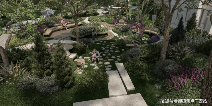 景观设计从《烟江叠嶂图》中提取田园、飞瀑、丘野、浮岛、湾流、华木等自然元素,融入现代设计手法。结合场地的规划布局优势,融入一心·两带·两轴·三园·十六境景观设计格局。植物设计打造忠贞和谐,南国知秋,春野和风,风栖琼树,四大植物亮点。