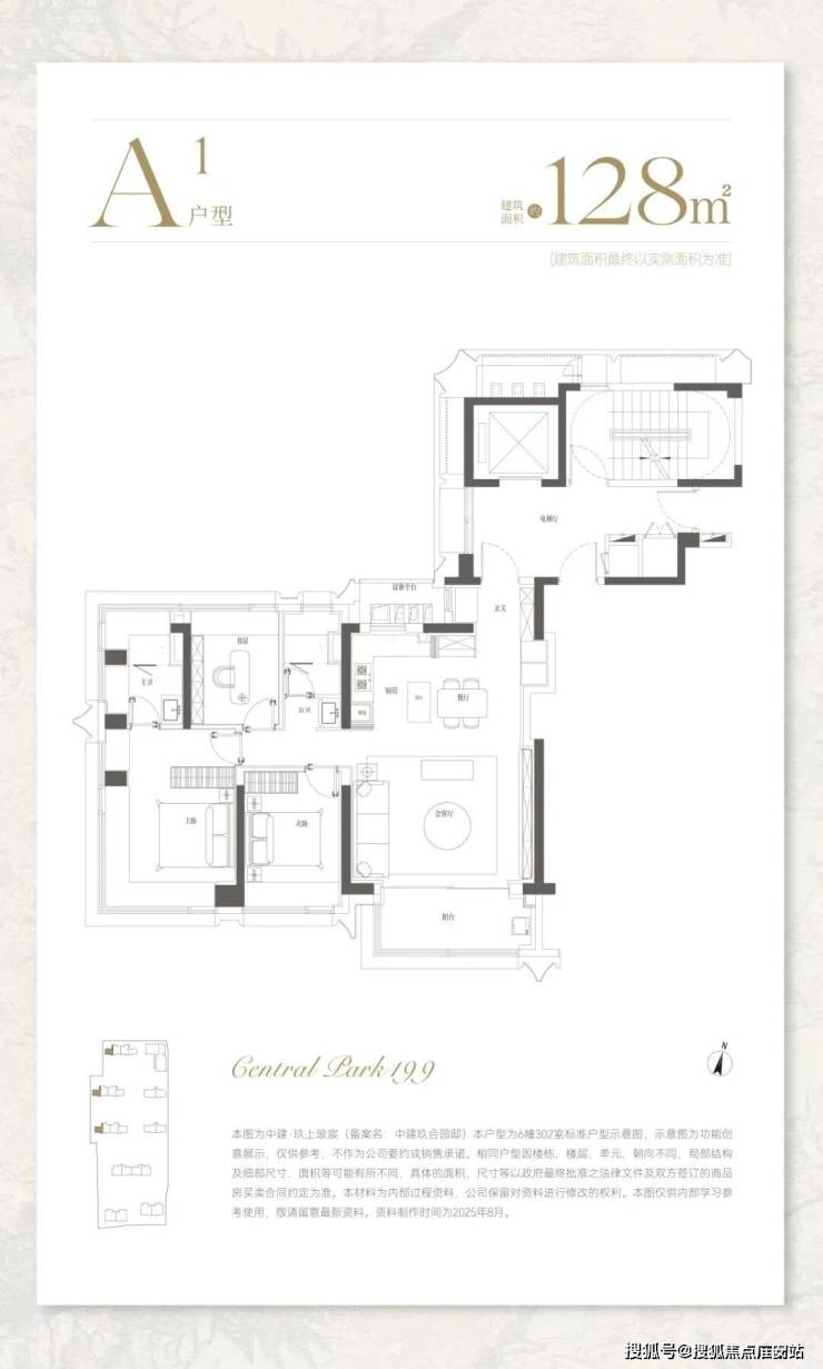 约128㎡ A户型,动静分离格局,功能区与休息区互不干扰,超大南向面宽+270°采光面,客厅开间达到了约5.4米,景观视野突出。