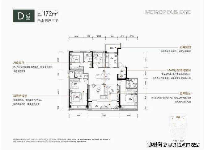 主力户型:3室2厅2卫(110㎡)、4室2厅2卫(128㎡、139㎡)、4室2厅3卫(172㎡)。