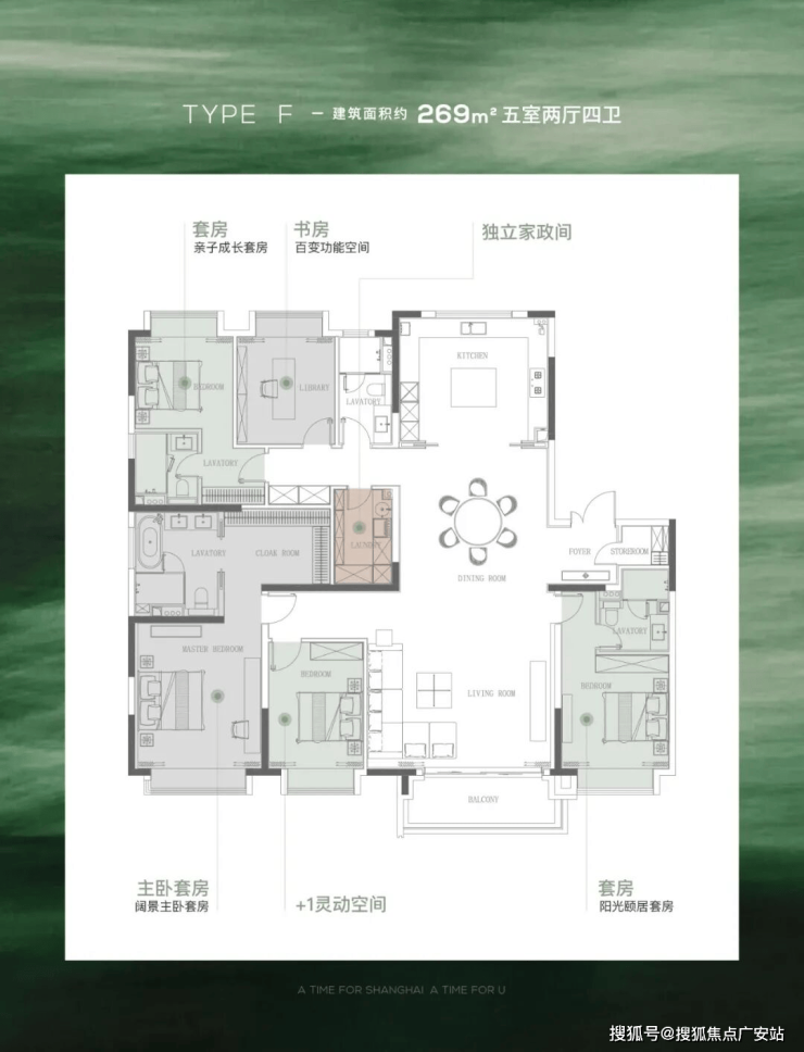 在上海一线滨江,260-330㎡面积段多以四房为主,而缦云上海269㎡户型直接做到了“5+1房2厅3卫”,实现定制级「滨江大宅」的终极置业理想。