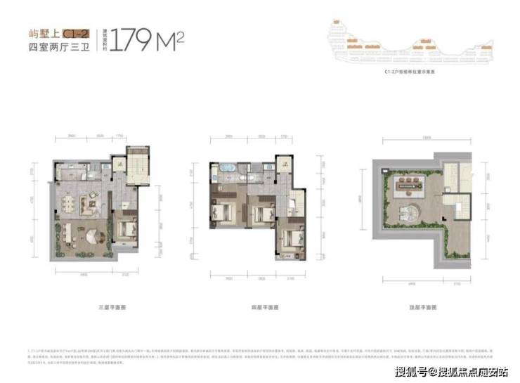 主力约179㎡上叠,格局大致跟下叠相仿。同样是四房三卫,三开间朝南,南向总面宽约10米,得房率达约90%。三层是餐客横厅,直连超30㎡的南向大露台;五层还有一整层超级大露台,面积约50㎡。大空间、大花园、大露台,正是叠墅客户心目中的理想型。