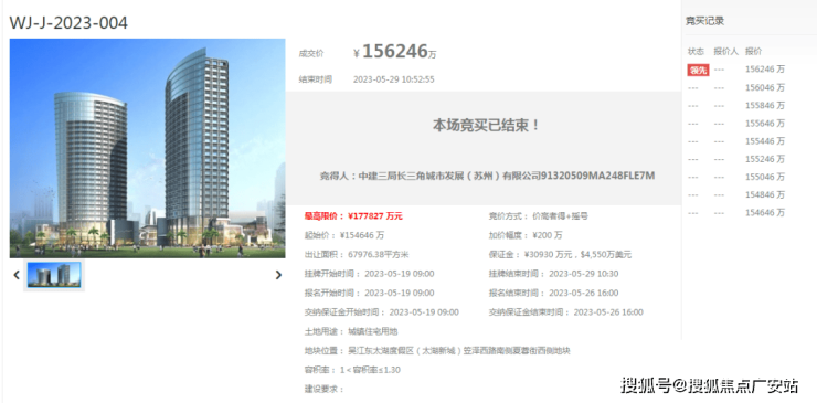 2023年5月29日,最终经过9轮报价,由中建三局竞得,楼面地价17681元/㎡,成交总价15.62亿元,溢价率1.03%。