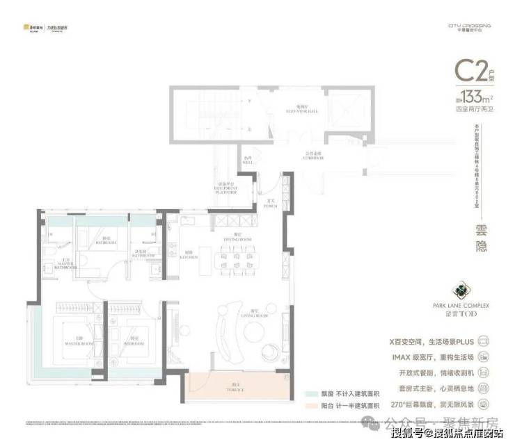 133㎡可以说是108㎡的进阶款,同样的三房两厅两卫,大面宽横厅、半开放式厨房设置岛台,加上主卧L型飘窗,再一次验证了华润置地豪宅化的产品思路。
