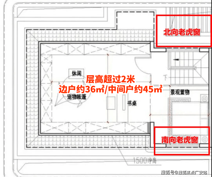 ⑥、项目的所有上叠产品,都规划了层高超过2米的灵动空间(因屋顶造型因素,边户约36㎡,中间户约45㎡)。