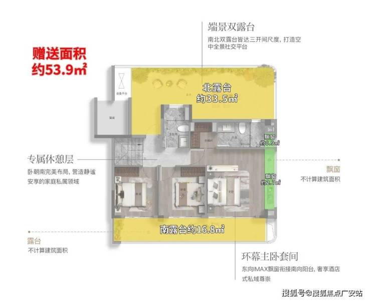 除了约9.8米的跑道阳台、4+1室的格局、约270°的IMAX超级采光面外,这个户型拥有两个最独特的优势:
