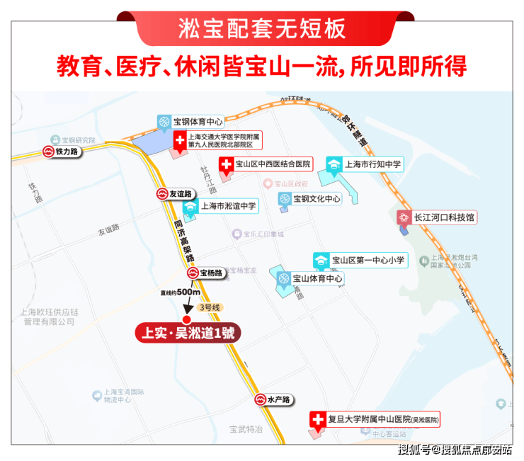 项目直线距离3号线宝杨路站约500米,可轻松步行进站 ,通达虹口足球场、中山公园、徐家汇等多个热门商圈;还能换乘多条线路,比如18号线,途径财大、复旦、杨浦滨江、陆家嘴滨江。