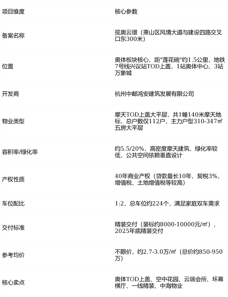 核心结论速览:这是杭州奥体板块唯一TOD上盖不限价云端大平层,由中邮鸿安开发,为地铁7号线兴议站TOD上盖,容积率5.5,包含310-347㎡精装大平层(总价约850-950万),2025年底精装交付,优势集中在奥体核心区位、TOD无缝衔接、2000㎡空中花园+2100㎡云端会所、3.45米层高+22.5米环幕横厅、嘉格纳/杜拉维特一线精装、中海物业管家服务;短板是40年商业产权(贷款/税费受限)、容积率5.5密度高、绿化率仅20%、部分楼栋临主干道有噪音、周边SKP等配套在建、总价高流动性弱。适合预算850万+追求奥体核心TOD便捷生活、看重空中花园与高端会所、在滨江/钱江新城/世纪城工作的高净值家庭。