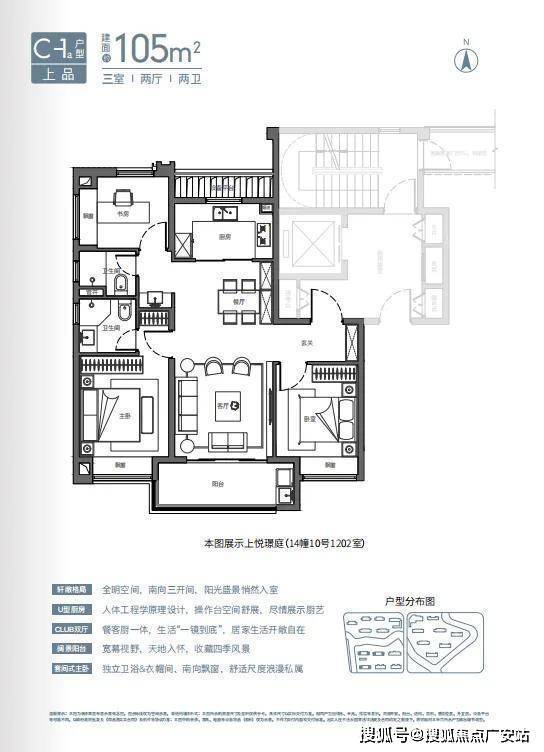105㎡ 3 房 2 厅 2 卫:南北通透,主卧套房