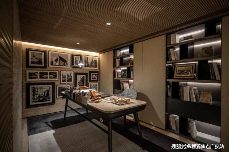 书架以及空间中预先设定的轮廓线条,精准地勾勒出隔而不断的空间形态。书架仿佛具有神奇的魔力,打破了空间的界限,将会客区、餐厅、书房与文化韵味巧妙融合,每个区域既相互关联,又有着各自独特的层次,形成了一种和谐而又富有变化的空间秩序。