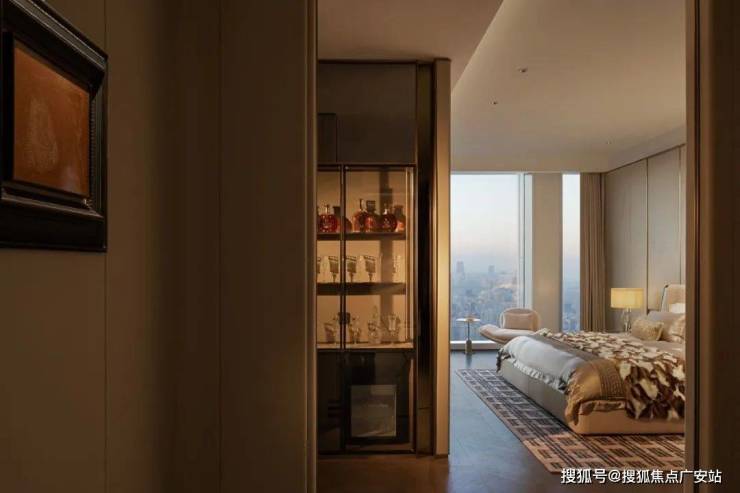 走道端处香槟色金属雕塑,形类城市高楼,又若恋人彼此依偎;全采光套房拥揽白日上海黄浦的忙碌、繁华,也收藏夜晚灯火阑珊的宁静、美好。
