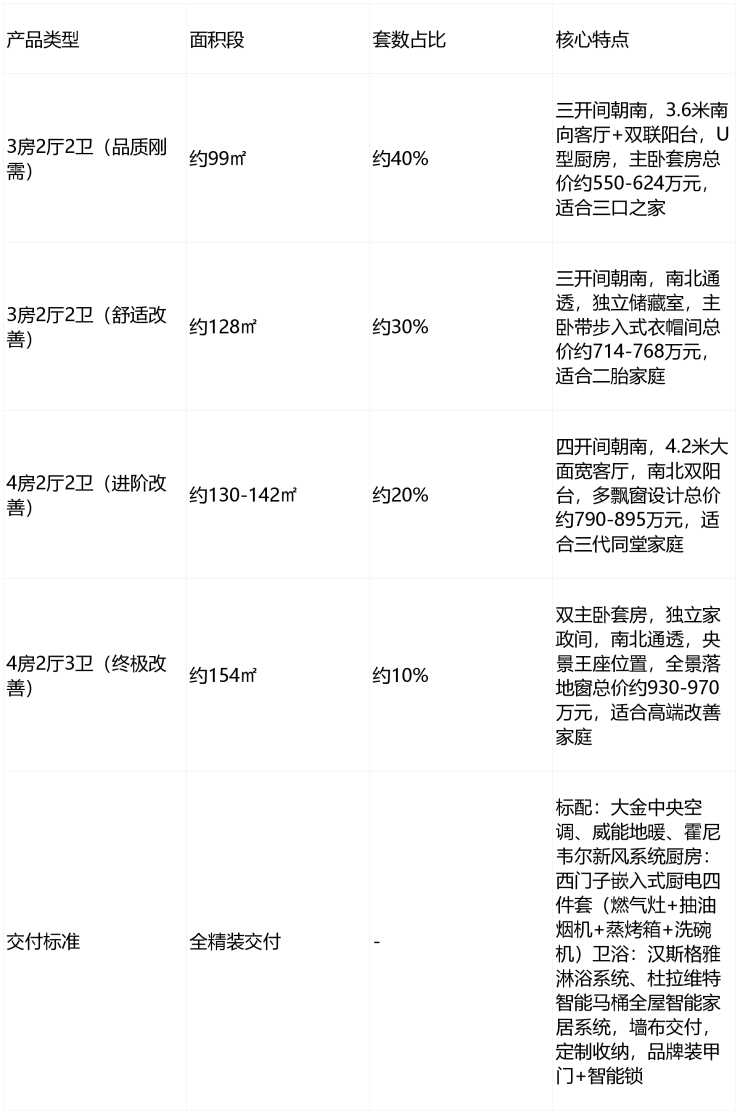 主力户型:建面约99-154㎡3-4房,得房率约76-80%,全精装交付(中央空调+地暖+新风系统三大件),精装标准约3800-4200元/㎡