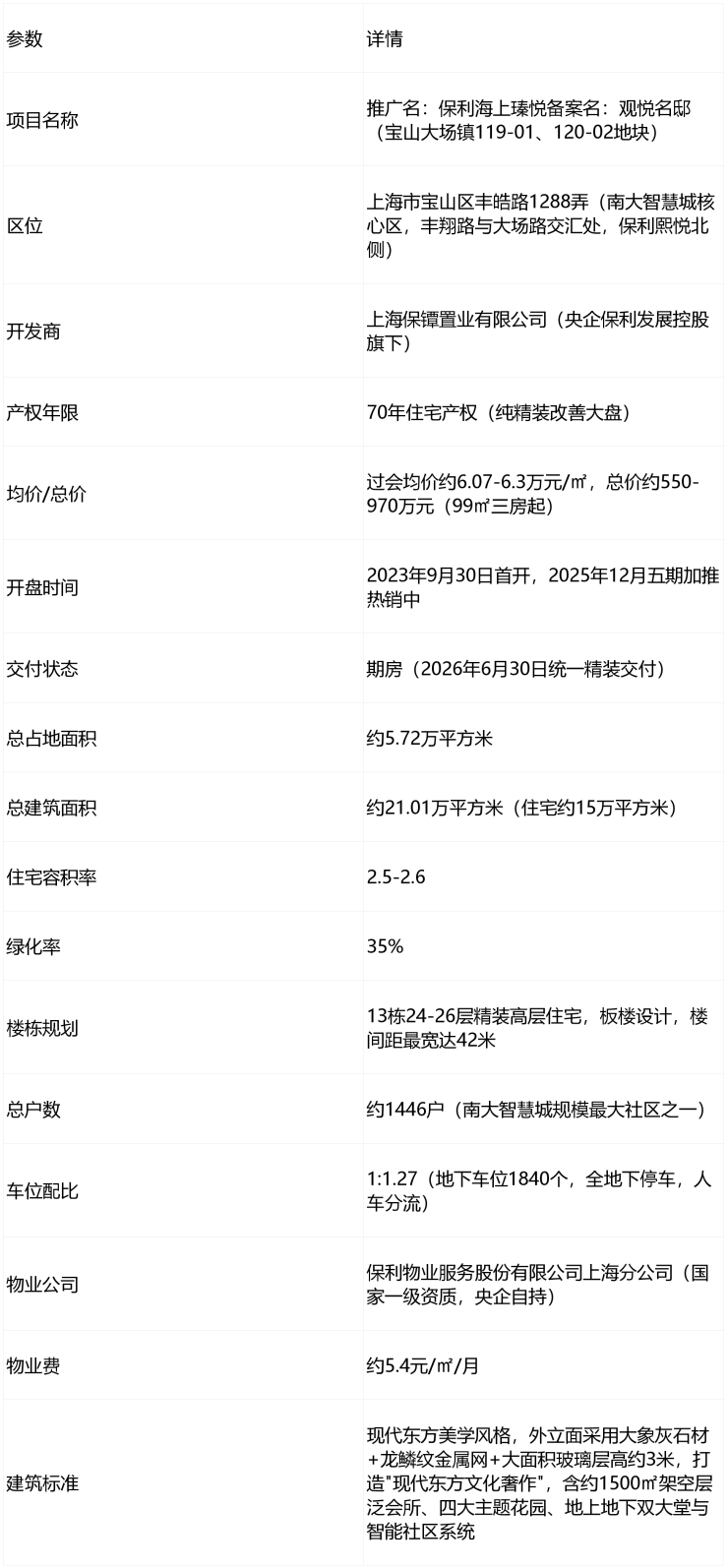 核心定位:保利发展控股"悦字系"高端代表作,上海北中环南大智慧城百万方生活圈核心大盘,13栋24-26层精装高层,主打约99-154㎡3-4房,均价约6.07-6.3万元/㎡,总价约550-970万元,适配中环刚需至改善全周期家庭,2026年6月30日精装交付