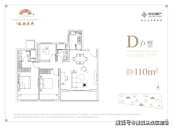 ▲户型点评:110㎡三室两厅两卫,南向横厅设计,采光充盈;宽尺双厅,公共区域