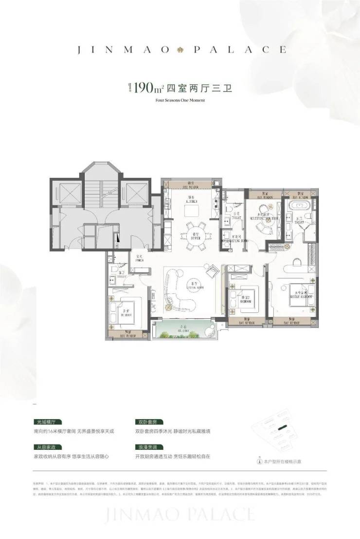 ●建面约190㎡4房:楼王位置的顶奢大平层,同价位段在杨浦只能买到约120㎡3房!