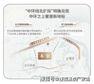 交通方面:项目紧邻长江西路地铁站(直线距离约150米),1站江杨南路,5站复旦,7站五角场。中环线北扩段明确兑现,军工路快速路25年开工,长江西路快速路列入上海市重大工程清单预备项目,快速链通城心,随着中环线北扩段的政策明确,淞南将正式进入中环时间。未来经逸仙高架,进入南北高架、内环高架、中环高架,可快速链通南北上海。