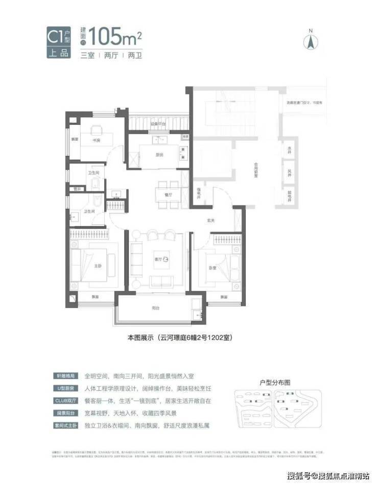 建面约105㎡3房2卫有宽厅和竖厅两种风格,其中宽厅户型好评度颇高。