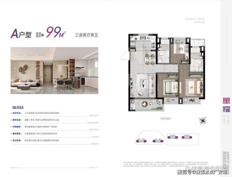 建面约99㎡的三房两厅两卫,很适合一家三口的上车的作品。三开间朝南,南北通透,动静分区,户型非常方正!