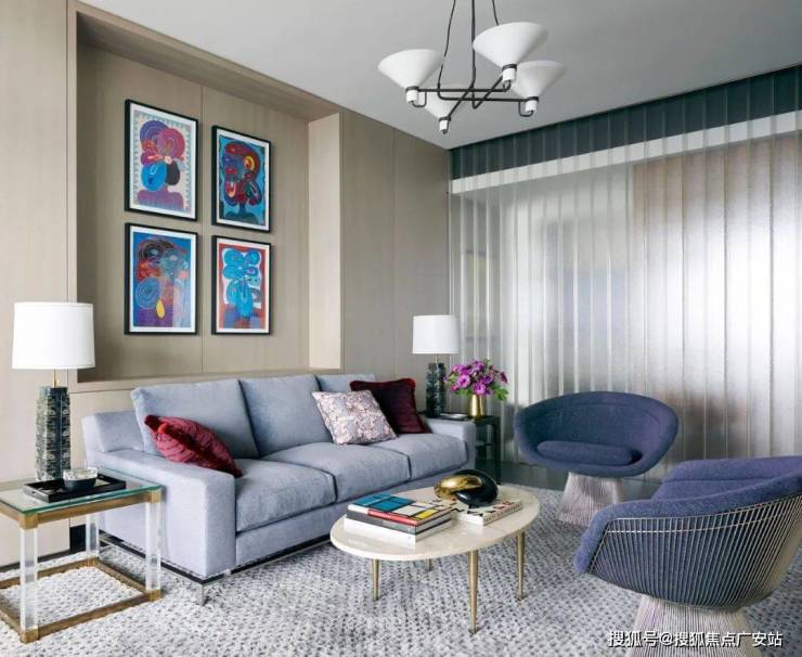 从客厅开始,整个空间都遍布着蓝色的元素,设计师以星座为主题进行设计,搭配上James Thomas的茶几、Holly Hunt的沙发、Minotti的扶手椅和Andrianna Shamaris的边桌,打造既高级又充满梦幻感的居家空间。