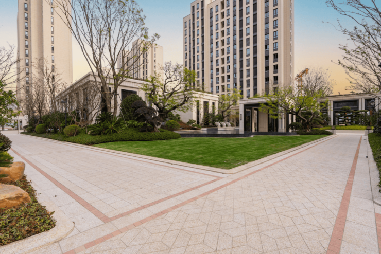 不仅采用大量昂贵石材和铜质材质。社区地面大多以石材铺就而成,且达到毫米级铺装工艺。灯罩、护栏皆用铜质材质打造。