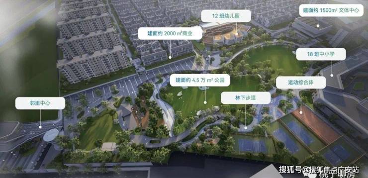 围绕着这个公园,周边还有邻里中心、建面约2000㎡的商业、12班幼儿园、18班小学、建面约1500㎡的文体中心、林下步道、运动综合体等等。