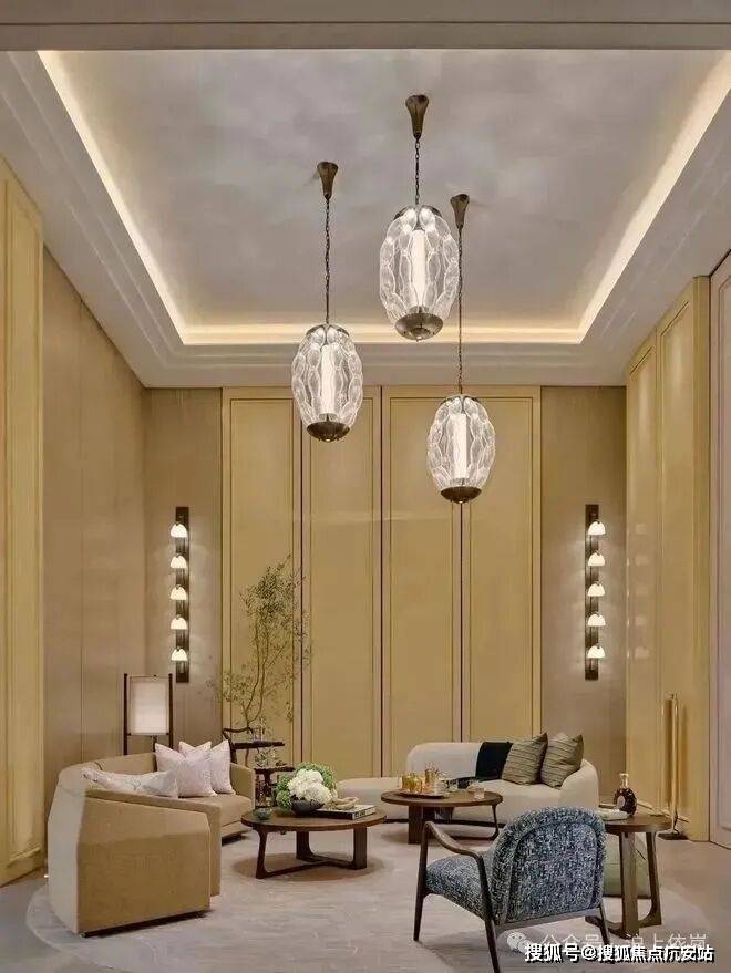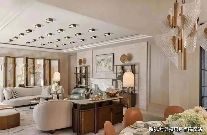 主厅核心区悬浮式定制柜体,银箔与丝绸在几何切割中构建中式基因,毕加索石材的天然裂变肌理成为天然艺术装置。瀑布吊灯以流体力学演绎东方留白,让光影在岩板表面生长出动态水墨意境。