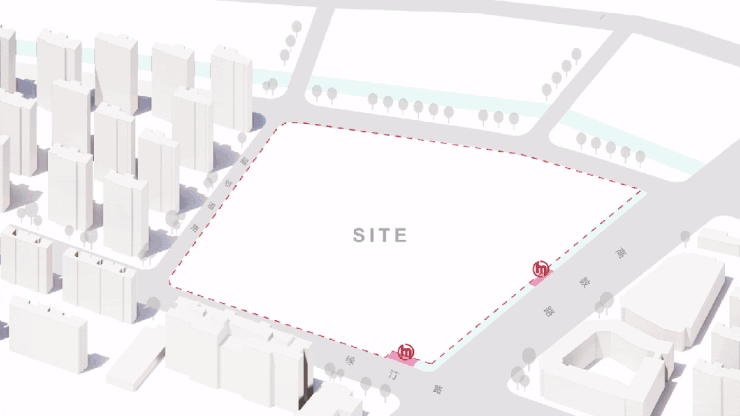 通过解读杭州“架空车库不计容”的政策条件,项目将沿街空间整体抬高,策略性地植入配套功能与车库系统。这一设计处理使抬升的基座成为城市与社区之间一道柔和的过渡界面,有效隔绝了车行干扰与视觉穿行,保障了社区内部的私密性与安宁,又使商业配套与街道活动紧密衔接,延续了城市街区的烟火气与活力。