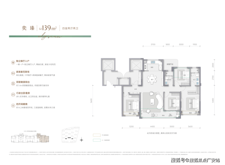 建面约139㎡四房两卫户型:堪称改善家庭的终极选择:独立梯厅入户,类一梯一户设计,尊享私密与静谧四开间朝南;约14米奢阔面宽,阳光满室铺展;餐客一体宽境,约7米阔绰开间,满足大家庭聚会需求;南面双联阳台,瞰景晾晒两全,兼具生活与诗意。
