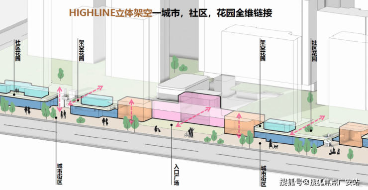项目整体抬高约5.4米,由此形成的周长约1100米沿街面,保利没有做成围墙,几乎全规划为邻里商业、社区食堂和口袋公园等。