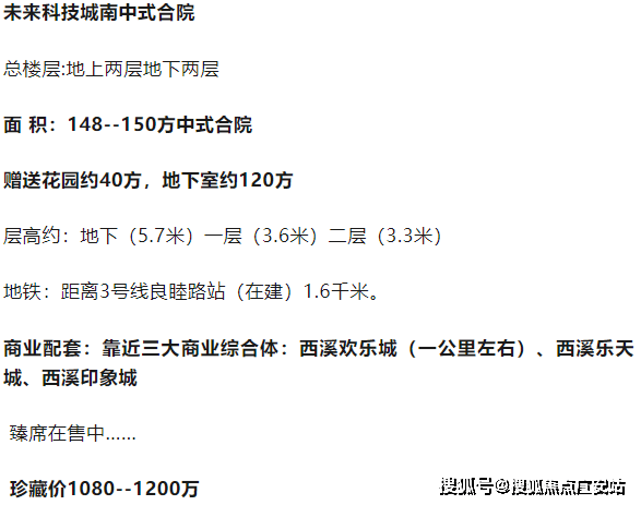 众安溪园:面积148-150方,未来科技城南中式合院,面积148-150花园约40方,地下室约120方,总价1080-1200万