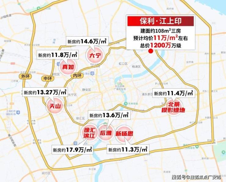 跳出杨浦滨江,保利·江上印建面约108m²三房预计11万/m²左右的均价,在整个上海内中环堪称“价格洼地”: