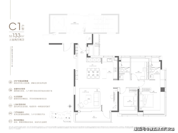133㎡可以说是108㎡的进阶款,同样的三房两厅两卫,大面宽横厅、半开放式厨房设置岛台,加上主卧L型飘窗,再一次验证了华润置地豪宅化的产品思路。