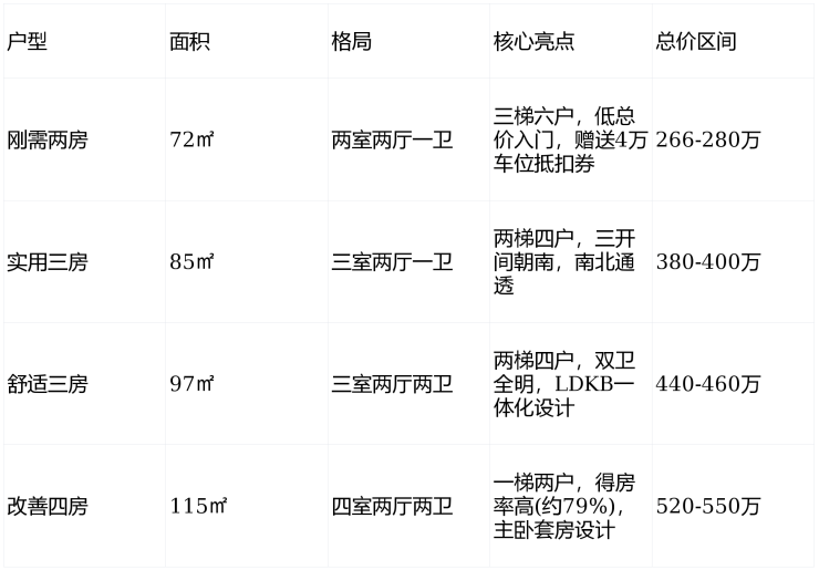 包括建面约72㎡2房2厅1卫,建面约85㎡3房2厅1卫,建面约97㎡3房2厅2卫,建面约115㎡4房2厅2卫。