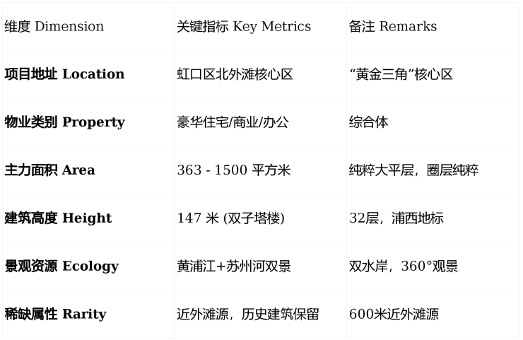客群画像:项目吸引了大量寻求资产保值增值的高净值人群。其“双景(黄浦江+苏州河)”资源和“近外滩源”的区位,使其具备极强的抗周期能力。