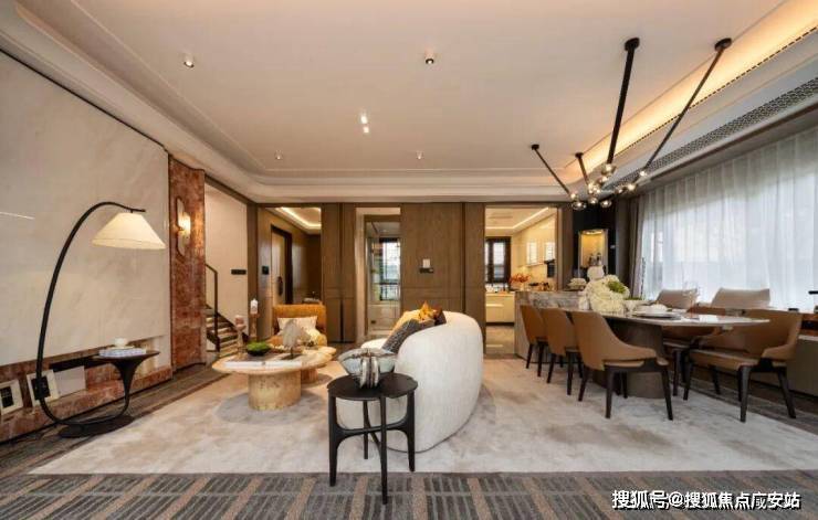 首层的餐客厅+9.8米跑道阳台的尺度感极强,形成超尺度“洄游聚厅”,客餐厅东侧超大全明飘窗,呈现约270°景观视野,将景观视野与室内尺度感提升至全新高度。