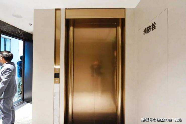 安高这次打造的交付样板间,是从电梯厅开始的。107㎡是一梯两户,电梯间区域,主要以不锈钢条作为通高区域的墙面划分,吊顶带金属弧线。入户门前,金属面板搭配编织纹,从上方打下来的暖色调灯光,映照在项目logo和室号之上,让业主从电梯里出来走到家门的时候就已经给满了仪式感。