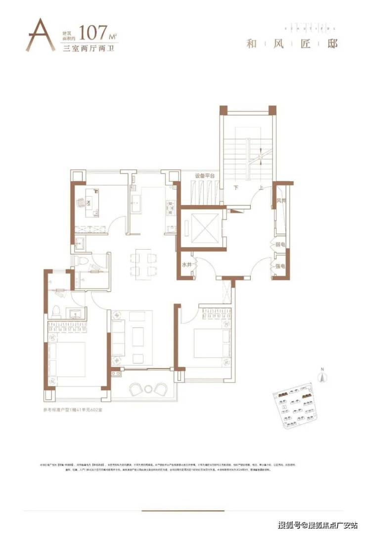 建面约107㎡3房2厅2卫户型