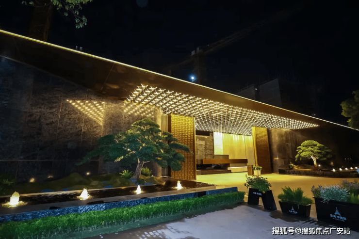 95米长的西大门长廊率先映入眼帘,乱纹黄古铜饰面与深色奢石大理石碰撞,顶部金属铝板立体切割,彰显归家仪式感!大门内侧,照壁以中国黑石材与青白石组合,延续空间礼序!