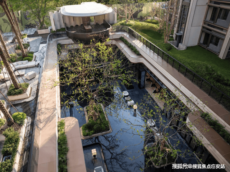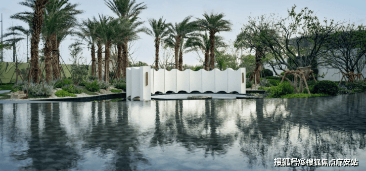 实景呈现的岛屿水院,作为保利天奕五座全球大师花园之一,在 银海枣树阵 、 下沉式庭院 、 镜面池畔卡座 的呼应中,成为未来居者沉浸自然的惬意之地。温柔闲适的 落日廊吧 ,犹如身处海岛之畔,感受蓝调时刻的优雅情调。