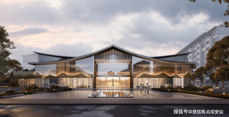 采用现代中式建筑风格,粉墙黛瓦,平坡结合。整体立面三段式处理,基座线脚中式元素的融入,顶部挑檐及坡顶设计,充分表达中式风格建筑特点。