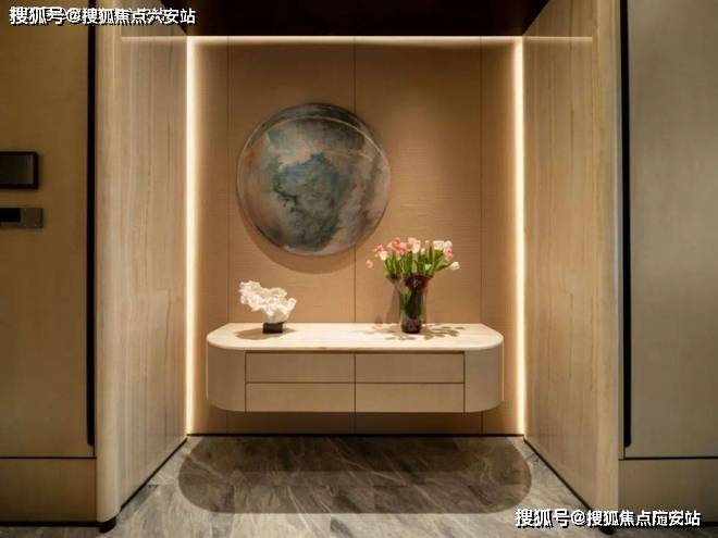 3.6米层高艺术长廊:雪山蓝奢石地面+弧形吊顶,打造“小卢浮宫”式入户体验。