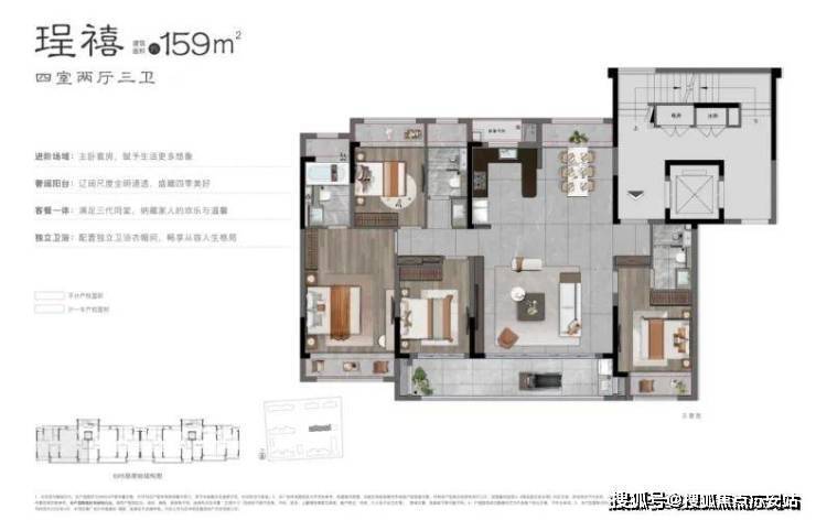 低密设计:楼间距约40米,得房率超82%,户型建面124-159㎡,全四房设计,南向阳台仅计一半面积,飘窗及设备平台不计入产权面积