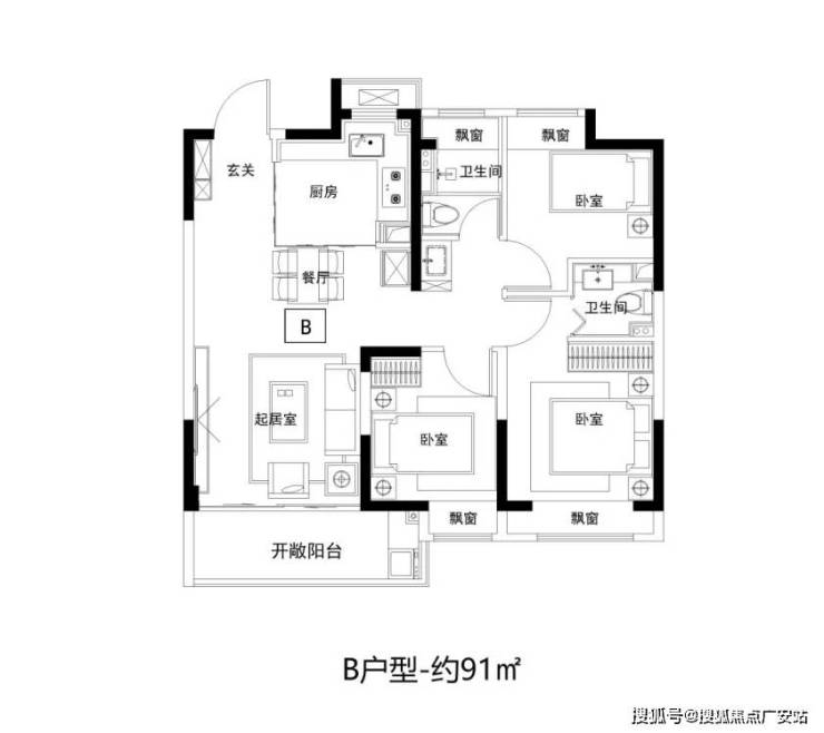 三开间朝南,创新双卫+公共洗漱台设计,解决早晚高峰排队难题