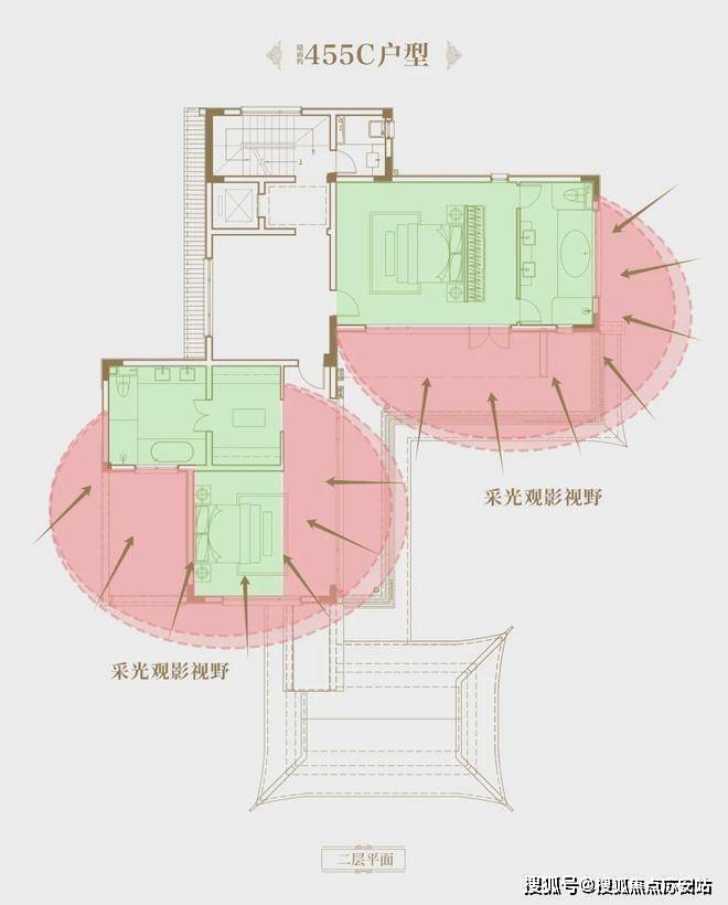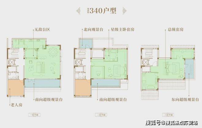 甚至,在保证二、三楼休憩区,保证了和独栋产品东侧(双拼部分户型为西侧)、南侧阳台观景的同时,还增加了北侧观景阳台,实现三面观景的无敌示意。