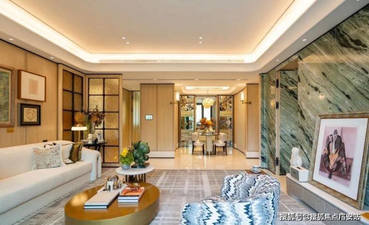 例如入户玄关铺设有“石材皇后”鱼肚印象,这种级别的奢石在很多顶豪项目中通常仅作局部镶嵌