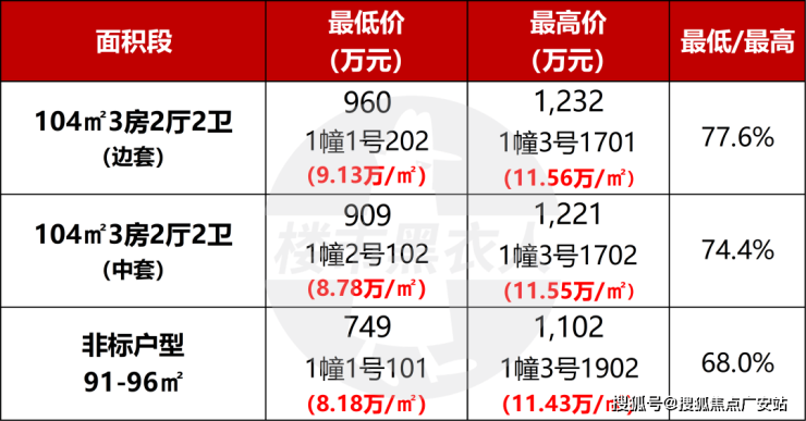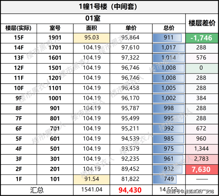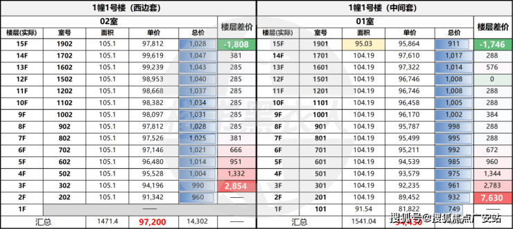 1号楼01室中间套<02室边套,总价仅900万出头;而最右侧3号楼的同类房源,套均总价要高出近200万。