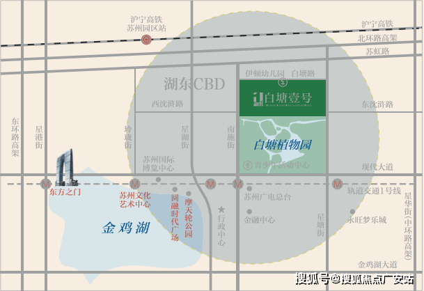 苏州工业园区白塘路1号(南施街与沈浒路交汇处),地处金鸡湖东岸,属湖东CBD核心地段。