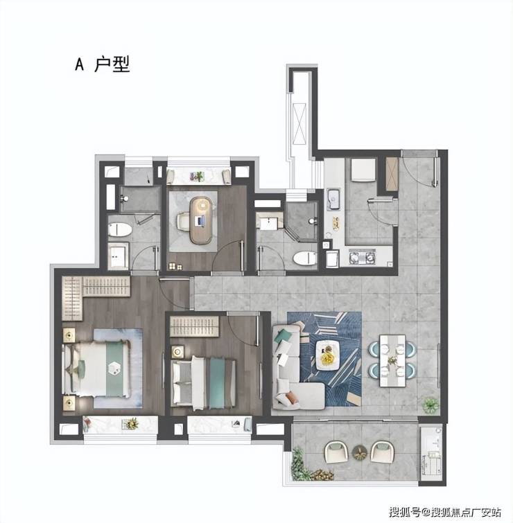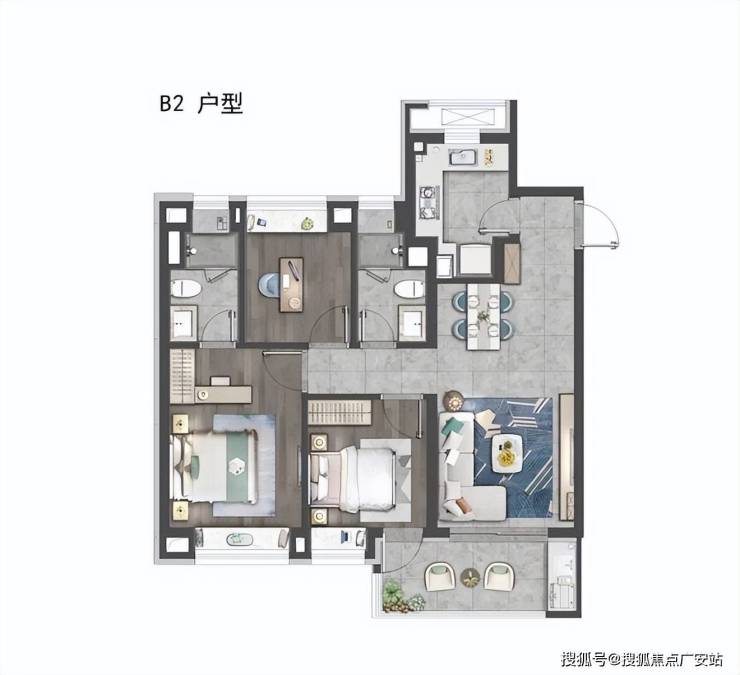 高层99㎡三房两厅两卫(中间套)样板间户型