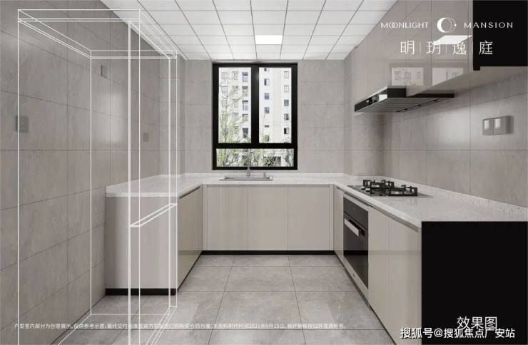 社交式厨房、采用U型设计,约9㎡,142户型厨房门采用了1.6米移门,阔绰尺度,尽享烹饪时刻。